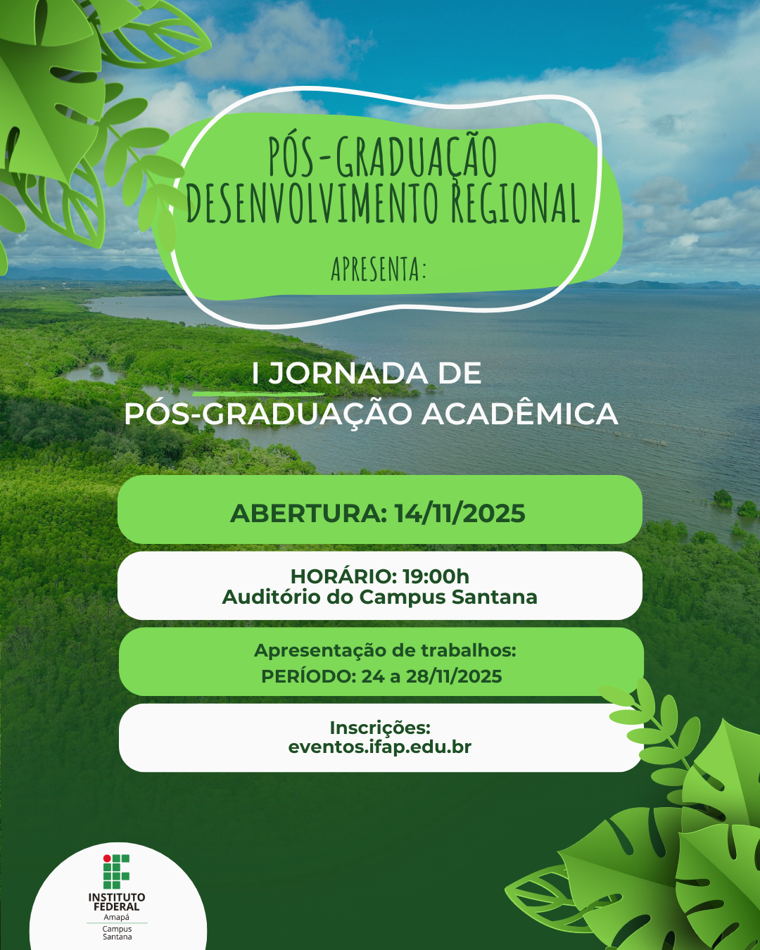 1ª Jornada de Pós-Graduação Acadêmica, evento dedicado à apresentação e avaliação dos trabalhos desenvolvidos pelos discentes do Curso de Pós-Graduação Lato Sensu em Gestão de Desenvolvimento Regional do IFAP, Campus Santana As sessões de apresentação de trabalhos, conduzidas por alunos, evidenciam a diversidade de temas que caracterizam o Curso de Pós-Graduação em Gestão de Desenvolvimento Regional. Os estudos abrangem áreas como bioeconomia, petróleo, gestão de órgãos públicos, gestão de empresas privadas, inovação tecnológica, gestão de recursos da biodiversidade, reforçando o papel do Instituto Federal do Amapá na formação de profissionais qualificados e na produção de conhecimento científico de excelência. Abertura: 14/11/2025 Horário: 19h Local: Auditório do Campus Santana