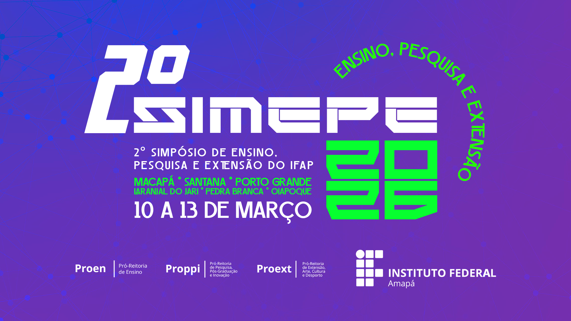 Seja bem-vindo(a) ao II SIMEPE – Simpósio de Ensino, Pesquisa e Extensão do Instituto Federal do Amapá (IFAP). A primeira edição do evento ocorreu em 2025 e foi um marco no fortalecimento das áreas finalísticas do IFAP. Sendo assim, retornamos com o compromisso renovado de integrar a comunidade acadêmica e a sociedade em torno do conhecimento que transforma vidas. O SIMEPE, portanto, pretende se consolidar como o principal ponto de encontro para a indissociabilidade entre o Ensino, a Pesquisa e a Extensão. Nesta segunda edição, nosso objetivo é ampliar o diálogo, promovendo o intercâmbio de saberes e práticas inovadoras que impactam diretamente a formação de nossos estudantes.